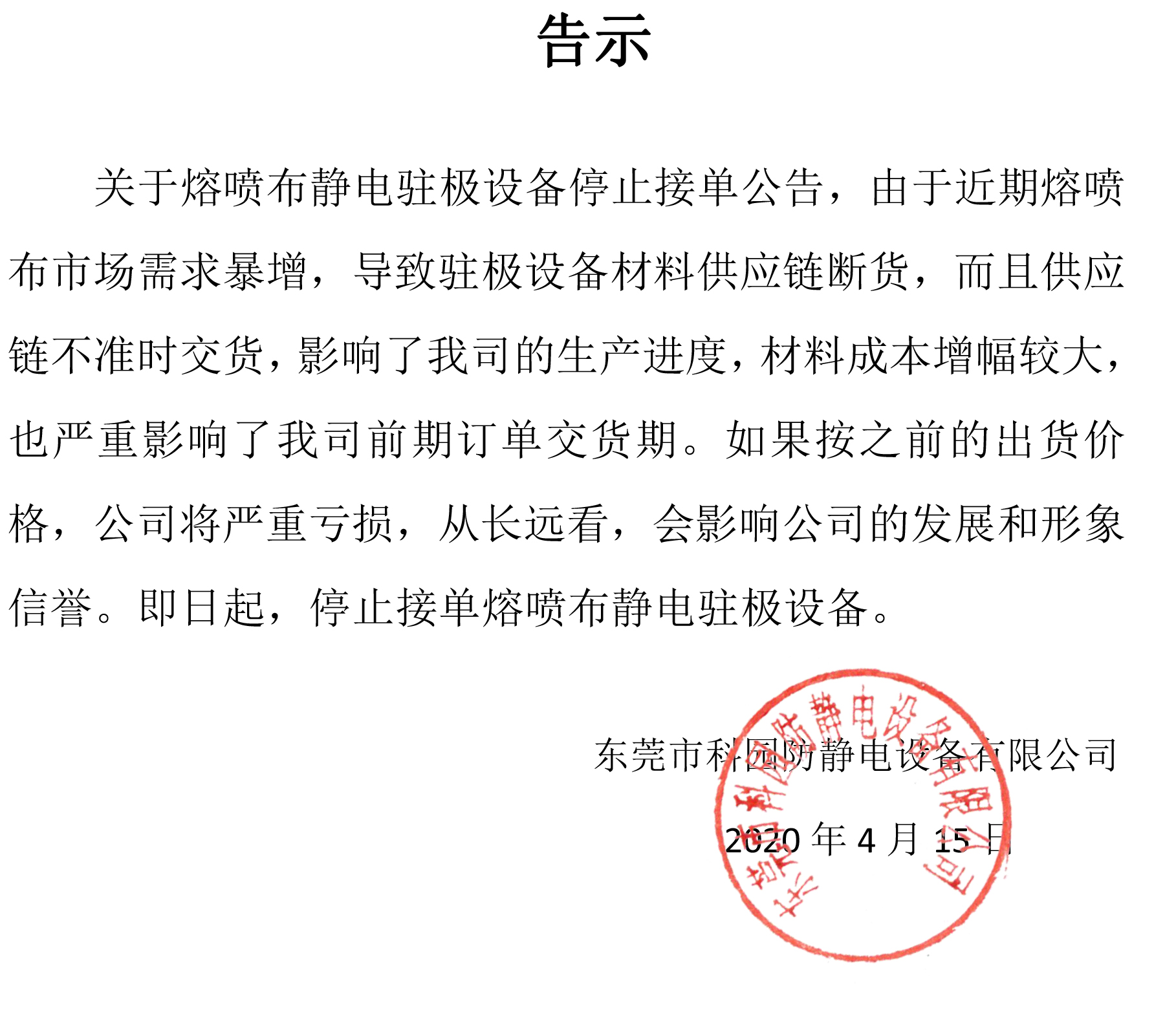 關于熔噴布靜電駐極設備停止接單公告,由于近期熔噴布市場需求暴增,導致駐極設備材料供應鏈斷貨,而且供應鏈不準時交貨,影響了我司的生產進度...